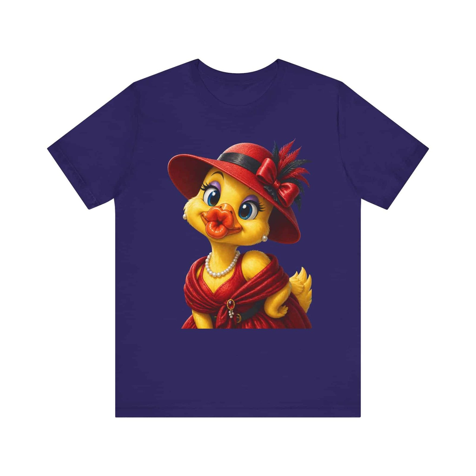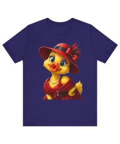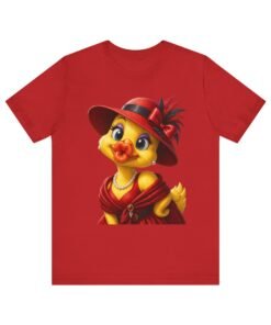 Wrap yourself in lighthearted charm with this airy cotton tee featuring a vintage-style duck in an elegant red dress, hat, and pearls. The illustration brings playful sophistication—bright eyes, a rosy beak, and detailed accessories—so the shirt reads like a wearable illustration that sparks conversation. It layers easily under jackets or stands alone with jeans for an outfit that feels warm, whimsical, and quietly stylish. Wear it to brunch, craft fairs, or slow weekend strolls to show off a love of nostalgic, character-driven art without shouting for attention.